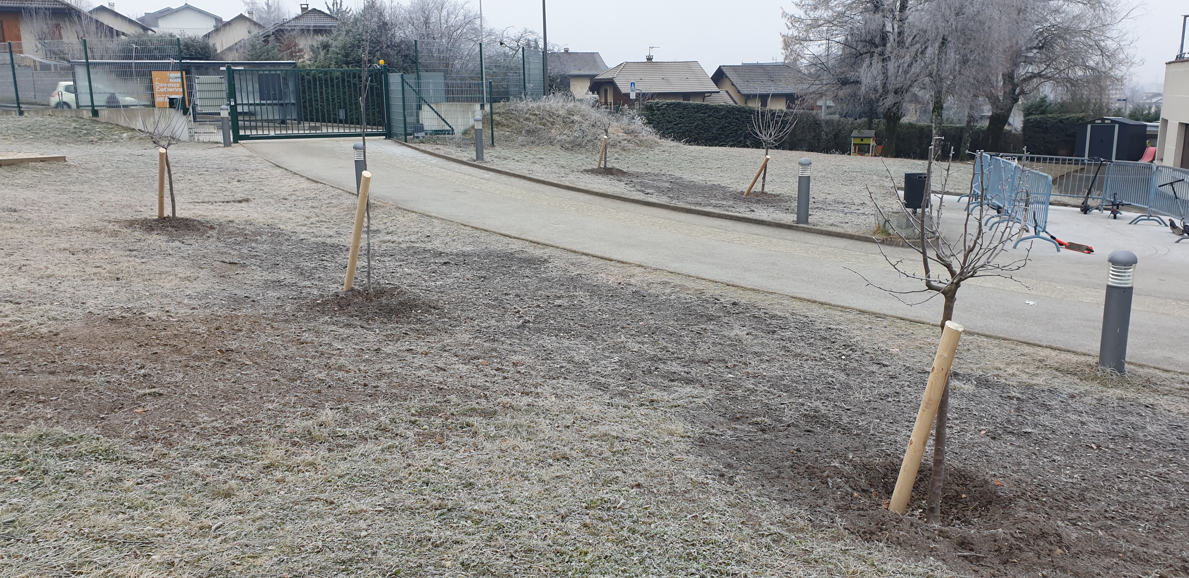 Premier acte d'une longue série, plantation de 5 fruitiers à l'entrée du collège.